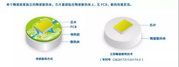 三思陶瓷像素技術(shù),將LED芯片直接貼在陶瓷散熱器上,熱量通過熱傳導(dǎo)作用直接傳至散熱體上,然后通過自然對流作用將熱量散發(fā)至空氣中。