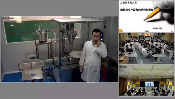 2019年10月31日,廣東省食品藥品職業(yè)技術(shù)學(xué)校的學(xué)生們像往常一樣進(jìn)行實(shí)訓(xùn)課程教學(xué)。但與以往普遍職校實(shí)訓(xùn)教學(xué)不一樣的是,老師和少部分學(xué)生在實(shí)訓(xùn)室上課,大部分學(xué)生在智慧課室上課,老師在實(shí)訓(xùn)室對(duì)設(shè)備結(jié)構(gòu)和操作進(jìn)行講解,學(xué)生在互動(dòng)智慧課室通過(guò)座位前的屏幕觀看老師上課。聽(tīng)課的老師們則在另外的觀課室對(duì)課程進(jìn)行全程的觀摩。