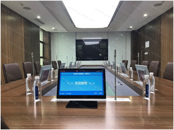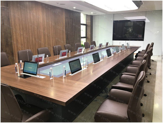根據(jù)會議室布局及相關(guān)設(shè)計標(biāo)準(zhǔn),萬邦醫(yī)藥無紙化系統(tǒng)中會議桌面采用嵌入式一體化雙顯升降終端,集成數(shù)字會議討論話筒升降一體。會議中一鍵手動、自動控制上升;會議后下降隱藏,不占桌面,整潔美觀。