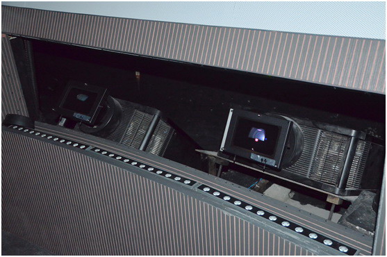 我們先走到“幕后”參觀,6臺VPL-GTZ280分布環(huán)繞安裝,在觀眾坐席的正前方與正后方分別有2臺VPL-GTZ280,另外2臺分列于坐席左右。VPL-GTZ280位于屏幕底側(cè),并采用傾仰式安裝,光線不會影響觀眾。