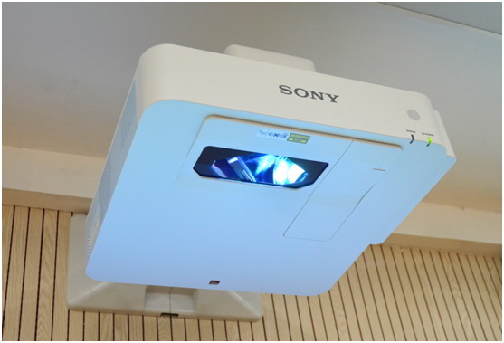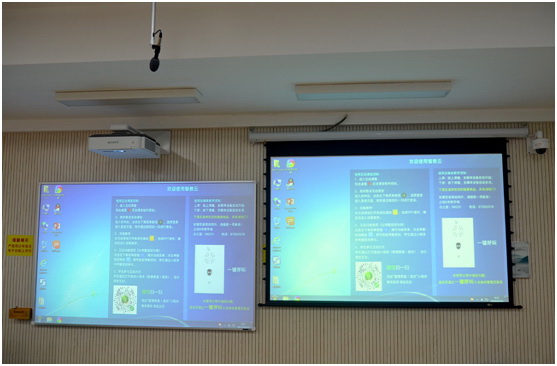 看過空間較大的階梯教室,下面我們來看幾個(gè)小型教室,它們采光非常好,每個(gè)教室都有一面墻是窗戶,燈光也非常明亮,對(duì)投影畫面的呈像效果提出很大挑戰(zhàn)。這里均采用VPL-U300WZ投影100英寸交互白板方案,效果讓人滿意,文字圖表與視頻圖片色彩真實(shí),亮麗細(xì)膩。