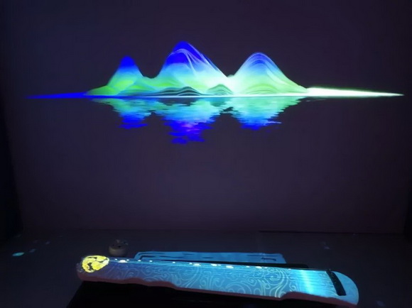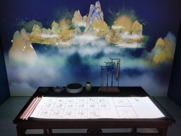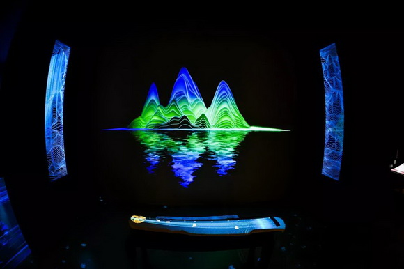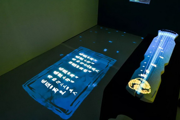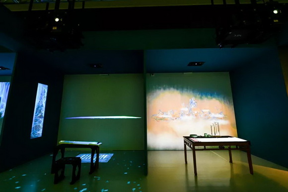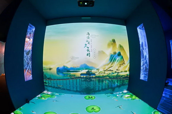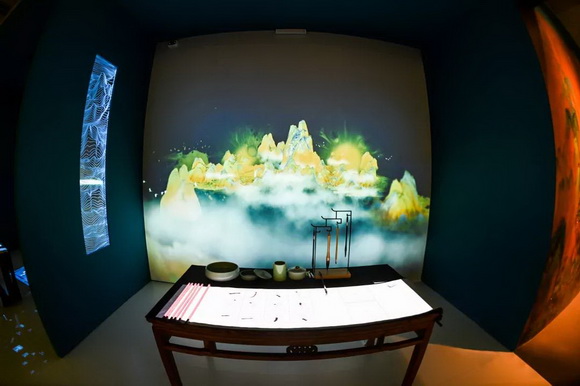 展場還設(shè)置了與《千里江山圖》相關(guān)的互動體驗(yàn)區(qū),包括“人間詞話”、“大象無形”、“弦外幽深”、“蘭亭山水”,讓觀眾能夠進(jìn)一步感受畫卷美的真諦。體驗(yàn)區(qū)通過光影、音樂、香氣等元素,豐富參觀者的視覺、觸覺、聽覺、嗅覺體驗(yàn)與想像,營造文人雅士在山水之間觀景作畫的情境。