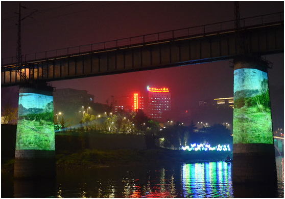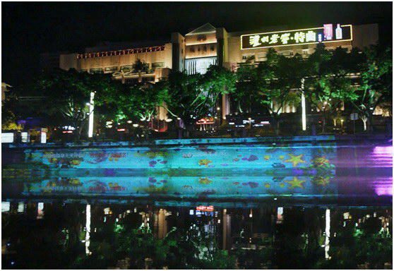 繼續(xù)順流而行,兩岸燈光繁華,在善后橋與洞天福地張家沱交匯處,燈光與投影秀利用沱灣獨有的地理優(yōu)勢將夜游推向高潮。4臺VPL-F1205ZL在河堤上拼融投影了一幅精美的長幅畫卷,影像中水波蕩漾,錦鱗游泳,與溪水倒映成趣。