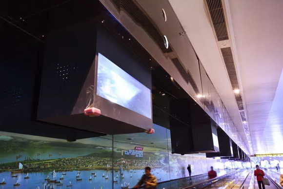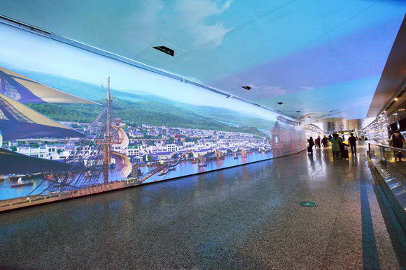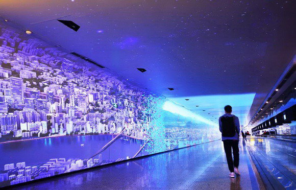 由鴻合工程顯示團(tuán)隊(duì)傾力打造的白云機(jī)場“時空隧道”,全長約200米,利用54 臺激光工程投影機(jī)實(shí)現(xiàn)“動靜結(jié)合、人景結(jié)合、虛實(shí)結(jié)合”, 是該機(jī)場首推的融媒體模式大型藝術(shù)體驗(yàn)新空間,在全國機(jī)場尚屬首創(chuàng)。