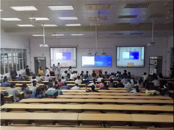 西科大的階梯教室,這里是重要課程或演講活動(dòng)的主要場(chǎng)所,可容納200多人。在這樣的大型教室中,想讓所有學(xué)生都看清畫(huà)面內(nèi)容,除了對(duì)產(chǎn)品本身亮度、分辨率、色域有更高要求,更需要投影機(jī)能投射超大畫(huà)面。