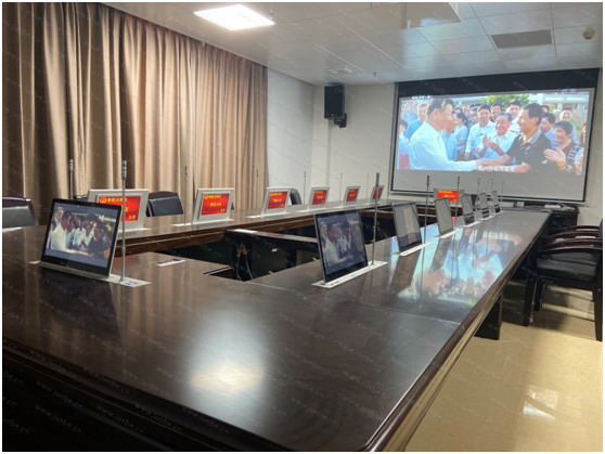 會議室作為溝通、決策的議會要地,設(shè)計(jì)的無紙化會議系統(tǒng)管理平臺,按會議室布局,配置了14點(diǎn)位的1080P高清液晶雙顯帶話筒升降一體機(jī),可提供會議通知、會議發(fā)布、會議簽到、投票表決、同屏批注、投影、視頻播放、交互式電子白板、語音轉(zhuǎn)文字識別、呼叫服務(wù)、一鍵文件加密歸檔等豐富的會議服務(wù)功能。