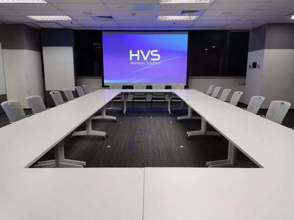 使用2臺(tái)98”移動(dòng)顯示器,2臺(tái)NEC高流明投影機(jī)和150” 投影幕,搭配Cisco SX80視頻會(huì)議主機(jī)