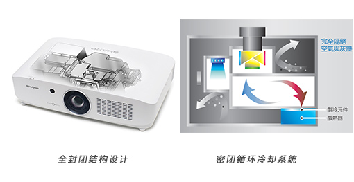 在投影機(jī)行業(yè)深耕多年的SHARP,近兩年來(lái)一直致力于防塵投影機(jī)的開(kāi)發(fā),研發(fā)出全封閉內(nèi)部循環(huán)冷卻系統(tǒng)。