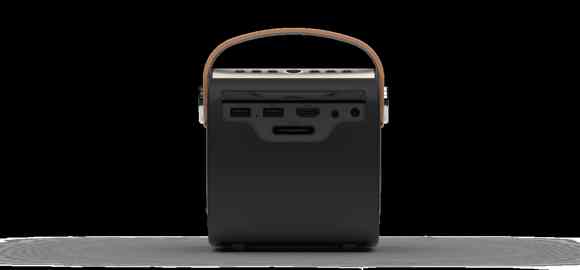 底部中間還設(shè)計(jì)有一個(gè)1/4英寸螺絲孔,用于連接支架。底部有四只可調(diào)節(jié)高度的防滑腳墊。背面的面板上分別有電源接口、USB2.0、、HDMI以及3.5mm立體聲耳機(jī)輸出接口。