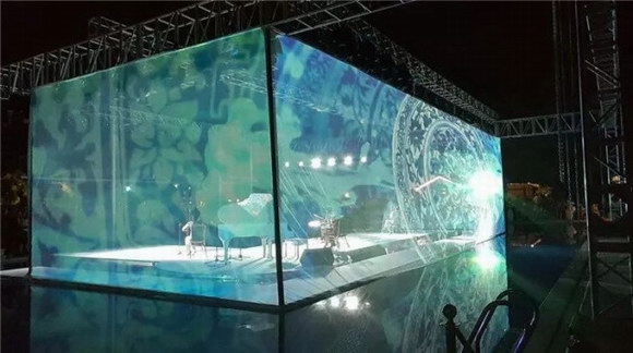 紗幕投影是一種借助于投影、射燈等投射成像的展示形式,其成像依然離不開實(shí)體的成像介質(zhì)。紗幕是網(wǎng)紗材質(zhì)的幕布,它的成像介質(zhì)是如輕紗般的薄幕,是以薄質(zhì)帶有網(wǎng)狀孔眼的棉布或化纖材料制成的半透明幕布,它可以是極為纖細(xì)的鐵絲網(wǎng)、鋼絲網(wǎng),也可以是不易被肉眼所見的紗布,所構(gòu)成的成像介質(zhì)能夠提供一種良好成像視效反映,在大型展示中,能帶來震撼的視覺沖擊力,不僅如此,還拓展了舞臺(tái)的空間層次感,增強(qiáng)了演出中演員與影像之間的互動(dòng),為演出增添了更多魅力。