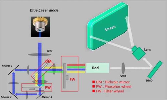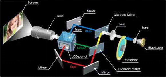 DLP技術(shù)是激光光源通過(guò)透鏡和色輪,經(jīng)過(guò)DMD芯片的數(shù)字處理,最終將畫(huà)面投射到屏幕上的一種技術(shù)手段。