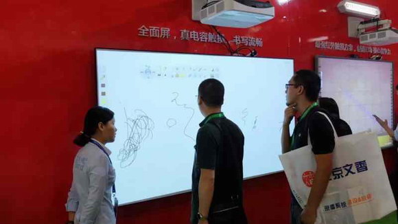 搭配純激光光源的超短焦激光投影機(jī),色彩逼真艷麗、明亮清晰,節(jié)能環(huán)保無毒無害,使用壽命高達(dá)20000小時,不存在更換燈泡光源的問題,高效防塵,更加穩(wěn)定耐用,更易于安裝、管理。通過與DrawView白板教學(xué)軟件、大小屏互動軟件等組合而成的智慧教育教學(xué)環(huán)境更是吸引現(xiàn)場觀眾紛紛前來體驗(yàn)。