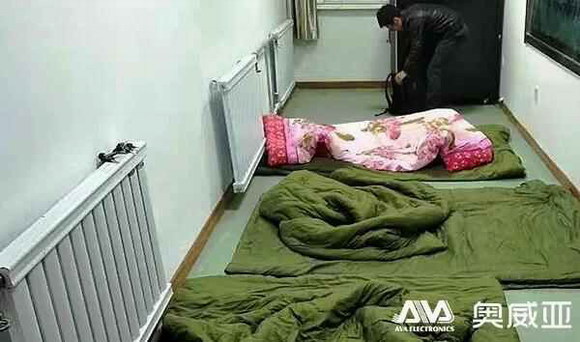 26間錄播教室分散在州屬貴德縣、貴南縣及興?h,奧威亞技服團(tuán)隊到興?h溫泉鄉(xiāng)寄宿制小學(xué)做設(shè)備調(diào)試,坐施工商的車從西寧出發(fā),歷時8個鐘頭抵達(dá)學(xué)校。為了能在第二天上課前完成調(diào)試工作,技服團(tuán)隊爭分奪秒接線調(diào)試,因第二天需要給老師做培訓(xùn),晚上只能留宿。鄉(xiāng)村沒有住宿店家,幾個人在教室打起了地鋪。海南州全年平均氣溫在4℃左右,苦寒難消,彼時外面還下著大雪,難以想象以地為席的他們是如何度過漫漫長夜。