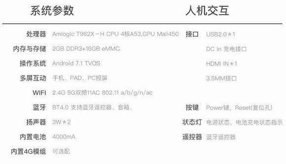 最后看看系統(tǒng)參數(shù),其處理器是Amlogic T962x-H,4核A53,處理器沒有太大的亮點,也只能說是能用吧。存儲搭配上選擇了2+16G的標配,也還算可以。既然是便攜性投影儀,自然是少不了配備電池了。這款投影的內(nèi)置電池是4000mA,如目前很多手機的電池容量差不多,但電池的使用時間肯定跟手機是沒法比的,估計能使用1到1.5小時吧。