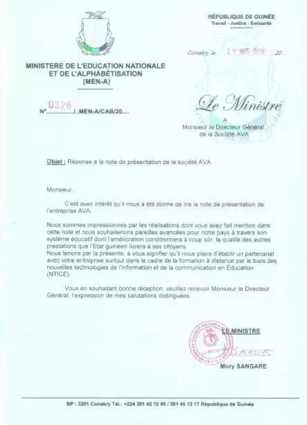 幾內(nèi)亞政府教育與掃盲部部長莫里桑加雷向奧威亞發(fā)出了官方邀請,正式確定奧威亞為幾內(nèi)亞國家遠(yuǎn)程教育平臺建設(shè)唯一合作伙伴,并邀請上市公司、奧威亞商務(wù)、技術(shù)人員赴幾內(nèi)亞調(diào)研市場、探討需求、洽談意向性訂單,為進一步全面搭建幾內(nèi)亞教育信息化系統(tǒng)開展相關(guān)工作。