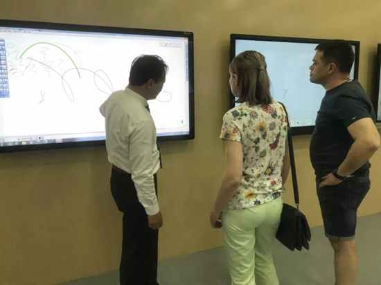 在參觀期間,歐洲同事對(duì)公司產(chǎn)品的實(shí)用性及操作性非常感興趣,由外貿(mào)經(jīng)理依次對(duì)產(chǎn)品給他們進(jìn)行了詳細(xì)的講解。從紅外觸摸方案與電容觸摸方案的對(duì)比,到電子白板、觸摸一體機(jī)、白板一體機(jī)、激光投影機(jī)等產(chǎn)品的演變歷程、功能、特性的介紹,最后對(duì)大家提出的問題進(jìn)行了一一解答。