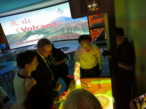 代表團(tuán)正在體驗(yàn)的是AR地理沙盤,這是一款寓教于樂的師生互動(dòng)教學(xué)設(shè)備?梢詫(shí)現(xiàn)投影的成像隨著沙堆高度的增加而逐漸呈現(xiàn)大陸架、海岸、陸地、湖泊、河流、山丘、雪山等地貌。讓學(xué)生在有趣的動(dòng)手實(shí)驗(yàn)中,輕松學(xué)習(xí)等高線、集水線等教學(xué)難點(diǎn)。