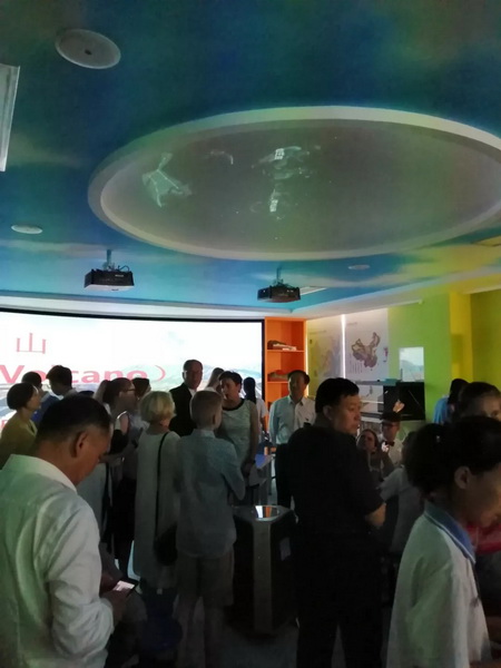 代表團(tuán)對(duì)多媒體超半球互動(dòng)球幕投影演示儀產(chǎn)生了濃厚的興趣。在這個(gè)立體半球演示儀上,既可以演示宇宙中的天體運(yùn)動(dòng) (如:太陽系八大行星等),也可以演示地球上的地理知識(shí)(如:全球氣壓帶、風(fēng)帶、洋流、地球剖面等)。教師可以根據(jù)教學(xué)需要進(jìn)行多角度、多方位、多對(duì)象的開發(fā)和演示,為提倡師生互動(dòng)教學(xué)增添新意。