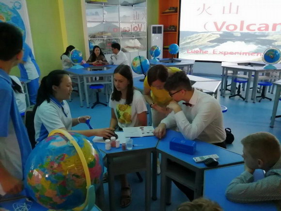 ▲代表團(tuán)和漯河實(shí)驗(yàn)中學(xué)的學(xué)生一起進(jìn)行火山噴發(fā)小實(shí)驗(yàn)