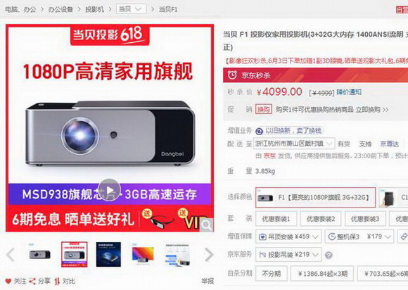 當貝F1超級投影儀,之前放進購物車的價格是4499元,現(xiàn)在的活動是直降400,如果你之前領(lǐng)了優(yōu)惠券,估計還能降點,就算是沒領(lǐng)到,直降400元也是很劃算了,而且該有的優(yōu)惠套裝都有的。