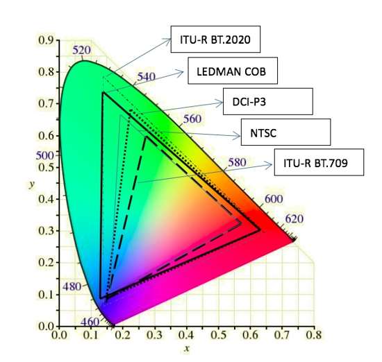 唯一比基于COB技術(shù)的Micro LED微顯示色域范圍更高的是ITU-R BT.2020色域,是基于Micro LED微顯示色域的118.92%,ITU-R BT.2020標(biāo)準(zhǔn)也是8K視頻要求的色域范圍。目前基于COB技術(shù)的Micro LED微顯示的色域范圍,如果要接近或達(dá)到ITU-R BT.2020標(biāo)準(zhǔn)的色域范圍,相對來說是比較容易實(shí)現(xiàn)的,從Micro LED微顯示的彩色顯示原理可以清楚看到,基于COB技術(shù)的Micro LED微顯示,采用紅、綠、藍(lán)三色LED芯片混光來實(shí)現(xiàn)彩色顯示,從圖2可以看到,LEDMAN COB的色域三角形,與ITU-R BT.2020的色域標(biāo)準(zhǔn)相比,主要是LED綠光芯片的波長范圍有些差異,可以通過與芯片廠家協(xié)同開發(fā),調(diào)整紅、綠、藍(lán)三種LED芯片的波長范圍及其他參數(shù),就可以做到盡量覆蓋ITU-R BT.2020的色域范圍,相對來說是比較容易實(shí)現(xiàn)。因此基于COB技術(shù)的Micro LED微顯示可以實(shí)現(xiàn)接近或達(dá)到ITU-R BT.2020的色域范圍,色域越大,能夠表現(xiàn)的顏色更豐富,更能還原自然界千姿百態(tài)的顏色。