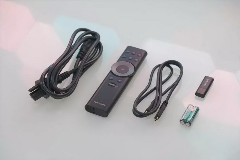 配件方面,除了剛剛提到的USB雙頻WiFi,提供了一根電源線,一根雙頭Type-C數(shù)據(jù)線,以及一個(gè)造型別致的遙控器,采用7號(hào)電池供電,在點(diǎn)擊時(shí)會(huì)有背光。