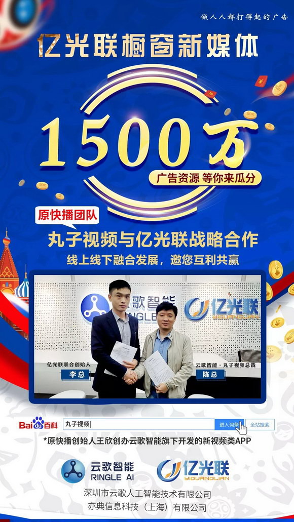 2019年4月20日,深圳市云歌人工智能技術有限公司正式宣布與亦典信息科技(上海)有限公司成為長期戰(zhàn)略合作伙伴。(注:億光聯(lián)隸屬亦典信息科技(上海)有限公司旗下品牌,丸子視頻隸屬深圳市云歌人工智能技術有限公司旗下品牌)。