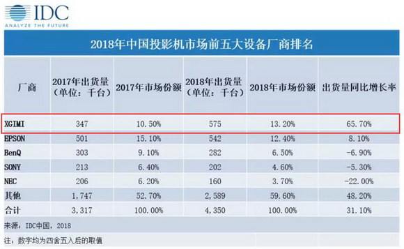 全球權(quán)威市場調(diào)研機(jī)構(gòu)IDC發(fā)布的中國投影機(jī)市場跟蹤報(bào)告顯示,2018年,中國極米以57.5萬臺的出貨量、65.7%的增速穩(wěn)居行業(yè)第一,打破了洋品牌稱霸中國投影機(jī)市場長達(dá)15年的局面;而2019年第一季度,極米不但繼續(xù)保持了領(lǐng)先的地位,更進(jìn)一步擴(kuò)大了與第二名的差距。