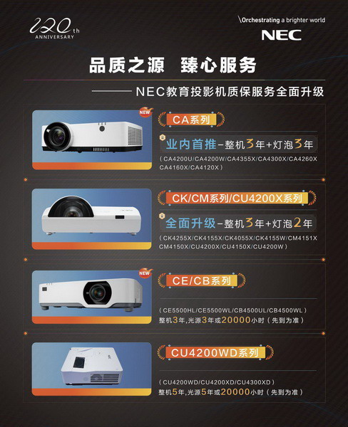 此外,NEC教育投影機(jī)還針對質(zhì)保服務(wù)進(jìn)行了全面升級,力求給教育客戶提供更完善的服務(wù)保障。針對HLD反射短焦投影機(jī)CU4200WD系列,NEC更是將服務(wù)做到極致,承諾5年整機(jī)質(zhì)保+5年光源(或2萬小時先到為準(zhǔn))質(zhì)保服務(wù)。不僅如此,NEC還針對旗下全系列投影機(jī)進(jìn)行質(zhì)保升級。正是由于NEC強(qiáng)大的售后保障措施,令用戶在選擇投影機(jī)時不用再費(fèi)盡心思研究參數(shù),而是給用戶帶來了更放心的使用體驗和更完善的售后保障,做到對用戶真正的負(fù)責(zé)。
