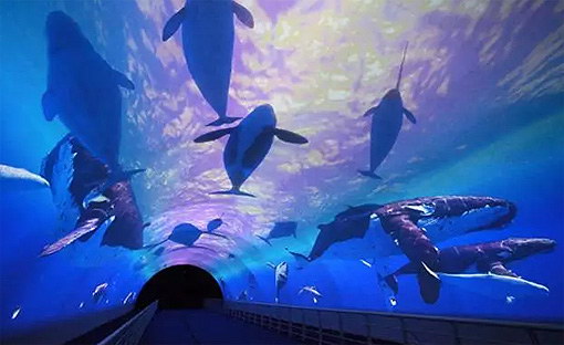 在2012年的設(shè)計(jì)方案中,安恒集團(tuán)采用28臺松下工程投影機(jī)PT-FDZ685搭配ET-DLE080鏡頭以正投、融合的方式對長40米、寬10米、高5米的半圓拱形天幕進(jìn)行投射,由中控系統(tǒng)和多媒體播放系統(tǒng)控制音響和影片的同步播放,打造出了前所未有的海底景象。正是因?yàn)檫@一次合作,安恒團(tuán)隊(duì)的專業(yè)性給客戶留下了深刻的印象。