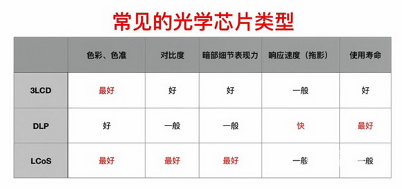 所以目前最主流的是3LCD、DLP和LCos這三種,他們各有特點(diǎn),3LCD的主要優(yōu)點(diǎn)是色彩好,而LCos一般出現(xiàn)在個(gè)別品牌的中高端機(jī)型上,價(jià)格相對(duì)也比較貴。而DLP的優(yōu)點(diǎn)是響應(yīng)快、壽命長(zhǎng),體積小,技術(shù)成熟,價(jià)格方面一般家庭都能接受,所以在家用領(lǐng)域占據(jù)非常大的優(yōu)勢(shì)。
