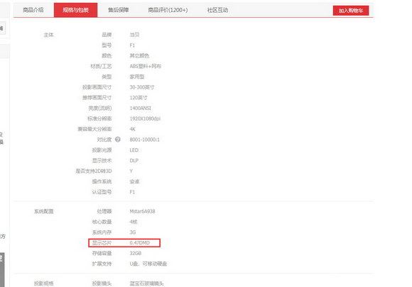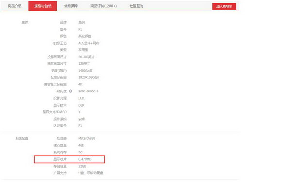 當(dāng)貝投影F1售價(jià)4299,芯片尺寸為0.47英寸。
