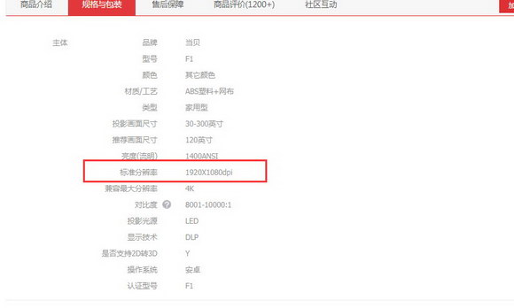而真正的1080P分辨率,如當(dāng)貝F1,廠家會(huì)在詳細(xì)參數(shù)里面標(biāo)示標(biāo)準(zhǔn)分辨率為:1920*1080P,這才是真正的1080P。