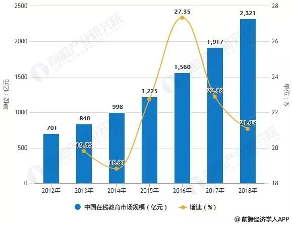 因此,在升學(xué)就業(yè)需求、技術(shù)創(chuàng)新、政策規(guī)范的共同促進下,我國在線教育市場發(fā)展迅猛,2012年市場規(guī)模僅為701億元,2017年市場規(guī)模已達1917億元,5年復(fù)合增長率達到22.3%。預(yù)計2018年我國在線教育市場規(guī)模將達到2321億元,同比增長21.07%。