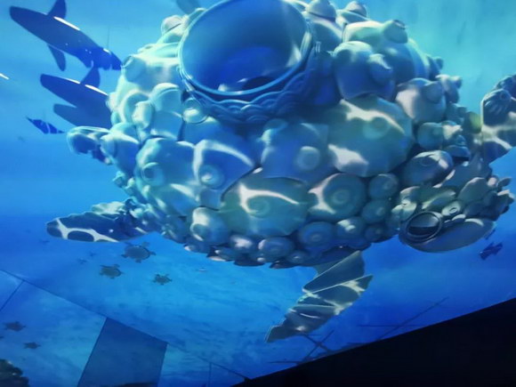 走進“南海礁”,可以看到魚兒在海底暢游,空間上方利用背投方式打造了一個奇幻浪漫的海底世界,墻面則采用立面鏡反射影像,營造了一個豐富的海洋瓷生物王國。