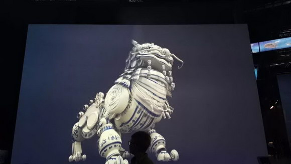 從主影廳走出,仿佛真的來到了瓷世界。一頭由多件著名瓷器瑰寶組成的象形瓷瑞獸首先映入眼簾。