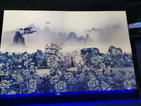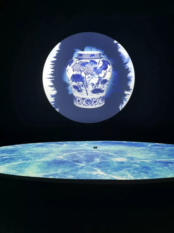 墻面上還掛著三個圓盤,每一個盤面上都記錄著一段青花瓷史,以3D Mapping秀的形式展現(xiàn)了不同時期的青花瓷款式、不同款式下的青花圖案,帶領(lǐng)人們走入一個豐富的青花世界,為觀眾營造出一個濃厚的視覺文化盛宴。