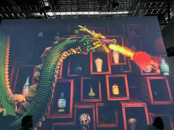 “LONG”在瓷世界中掌管著瓷器的燒制過程。在龍珠閣中,入門正對面是由光柵組成的萬瓷閣,展現(xiàn)了幾百件中國歷史上著名的瓷器,隨著觀眾的走動,光柵墻會隨視角的不同展示出不同的瓷器,動靜結(jié)合,虛實相生,讓人過目難忘。