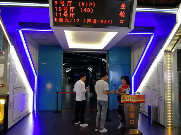 在這里,工作人員身穿航天服,檢票處被稱為登艙口,影廳門仿照太空艙門,全部模擬現(xiàn)實場景,為觀眾帶來一種真實的空間站體驗。