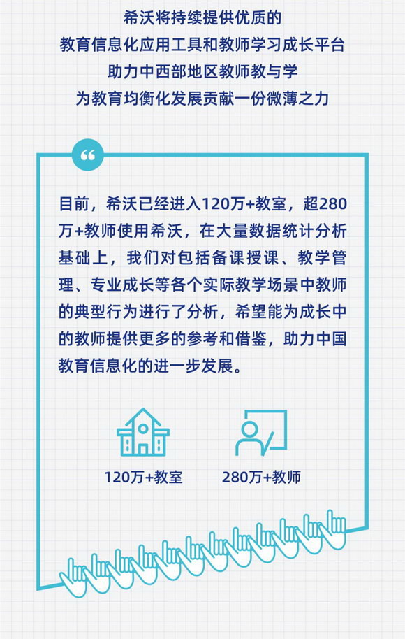 恰逢希沃十周年之際,希沃教育研究院聯(lián)合教育均衡化發(fā)展聯(lián)盟發(fā)布了《交互式多媒體教學(xué)環(huán)境下K12教師信息化教學(xué)行為分析報(bào)告》,基于海量希沃?jǐn)?shù)據(jù),全方位洞察信息化教學(xué)發(fā)展趨勢(shì)和特征,進(jìn)一步助力教師成長(zhǎng)。