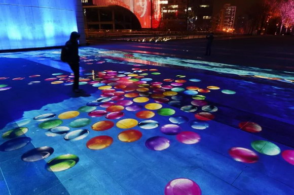 各種奇幻的影像在腳下綻放,魚兒隨著觀眾的腳步四處游竄,在虛擬的水面上泛起陣陣漣漪,讓人忍不住想?yún)⑴c到畫面中來(lái)。