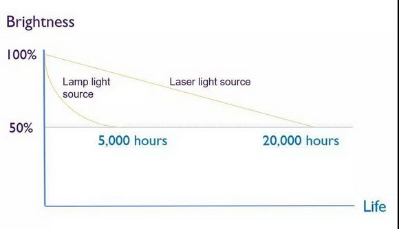 傳統(tǒng)(光源)投影儀使用的超高壓汞燈泡壽命一般在5000小時左右,而激光投影儀的光源壽命卻在20,000小時以上,按一年約250個工作日,每個工作日使用8小時計算,20,000小時約等于使用10年,在使用時長方面,激光投影儀一臺抵得上四臺傳統(tǒng)(光源)投影儀。