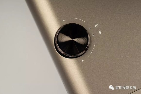 在我看來,優(yōu)派X10-4K整個(gè)設(shè)計(jì)最大的亮點(diǎn)就在于其位于頂部棱角處的旋鈕,因?yàn)檫@個(gè)X10-4K整體機(jī)身上唯一按鍵,并沒有如同傳統(tǒng)設(shè)計(jì)一樣設(shè)計(jì)在中間,而是位于頂部一側(cè)的棱角處,這種不對(duì)稱的設(shè)計(jì)設(shè)計(jì)感很強(qiáng),或許這就是其能夠獲得iF設(shè)計(jì)大獎(jiǎng)的一個(gè)原因。這個(gè)旋鈕按鍵既是電源開關(guān)(通過按壓控制),同時(shí)也是音量調(diào)節(jié)(通過旋轉(zhuǎn)控制)。