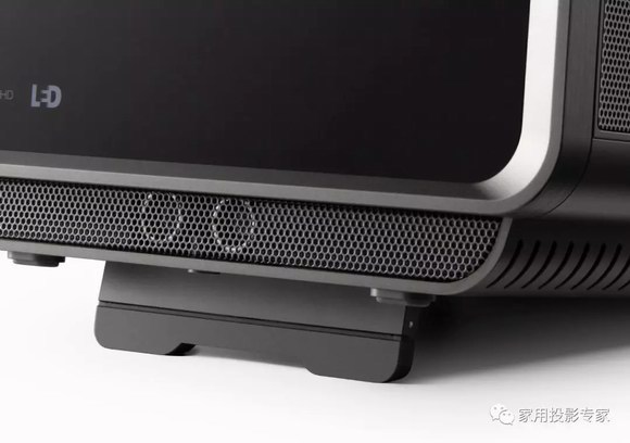 在優(yōu)派X10-4K的機(jī)身底部,我看到一個(gè)非常有創(chuàng)意的設(shè)計(jì)。在傳統(tǒng)的設(shè)計(jì)理念中,投影機(jī)底部四周都設(shè)計(jì)可調(diào)節(jié)投影角度高低的螺絲支架,而優(yōu)派X10-4K采用了一個(gè)兩段式可調(diào)整支架,提供了不同的高度調(diào)節(jié),不使用時(shí)還可以完全隱藏進(jìn)機(jī)身底部。
