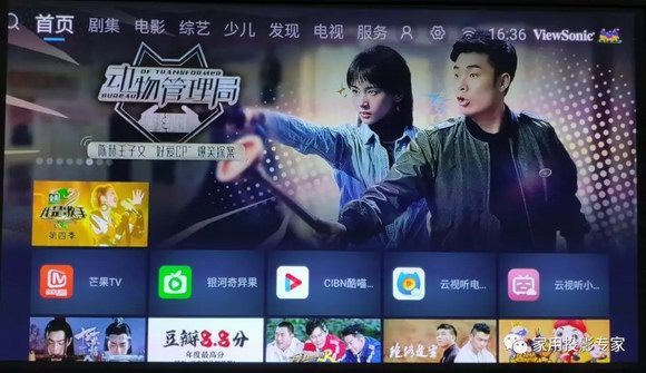 優(yōu)派X10-4K開機(jī)會(huì)有一段開機(jī)音樂(可以在設(shè)置中關(guān)掉),然后就會(huì)進(jìn)入其內(nèi)置芒果牛奶系統(tǒng)主界面。內(nèi)置操作系統(tǒng)是優(yōu)派X10-4K的特色之一,因?yàn)檫@解決了傳統(tǒng)投影機(jī)必須要連接外置視頻源的問題,只有要網(wǎng)絡(luò)和電源,X10-4K就能輕松實(shí)現(xiàn)大畫面影院。