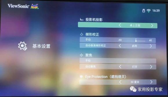 優(yōu)派X10-4K的基本設(shè)置界面,其支持的自動(dòng)聚焦功能和自動(dòng)梯形修正功能很不錯(cuò),因?yàn)檫@兩個(gè)功能能夠大大簡(jiǎn)化優(yōu)派X10-4K的使用步驟,基本上可以達(dá)到開機(jī)即可使用的效果。
