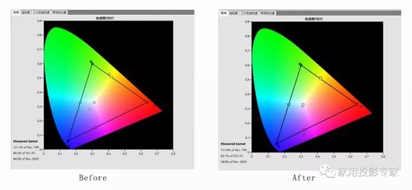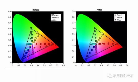 通過更為詳細(xì)的色彩測(cè)試的前后對(duì)比圖就能發(fā)現(xiàn),各個(gè)色彩標(biāo)準(zhǔn)點(diǎn)的準(zhǔn)確度都得到了大大提升。當(dāng)然,調(diào)試不僅僅針對(duì)色彩,還有g(shù)amma、色溫等多項(xiàng)調(diào)試內(nèi)容,此時(shí)的優(yōu)派X10-4K體現(xiàn)出了很多微型投影機(jī)品牌所不具備的優(yōu)勢(shì),那就是提供了較為豐富的調(diào)試選項(xiàng),這就為我們最終得到較為優(yōu)異的畫質(zhì)提供了保證。