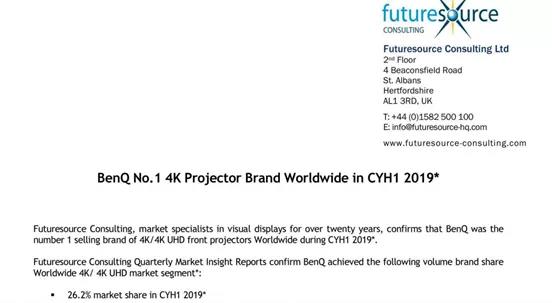 不僅如此,明基4K投影機(jī)于2019上半年全球市占登頂(根據(jù)FutureSource 報(bào)告),成為走進(jìn)消費(fèi)者內(nèi)心的高階投影品牌。