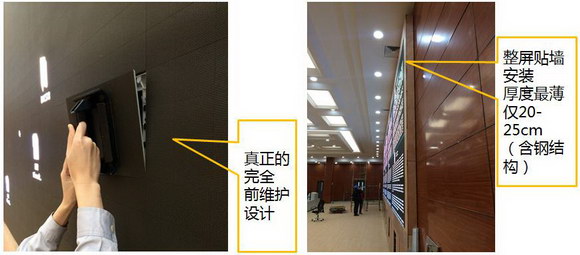 充分考慮到用戶室內(nèi)使用時對維護(hù)空間需求,臺達(dá)小間距LED采用真正的前維護(hù)安裝設(shè)計,此項(xiàng)設(shè)計明顯有別于市場上的“模塊前維護(hù)設(shè)計”,不僅顯示模組可以進(jìn)行屏前安裝、維護(hù),甚至包括顯示箱體內(nèi)部的控制系統(tǒng)、電源系統(tǒng)等所有零部件都完全實(shí)現(xiàn)了屏前維護(hù)。只需通過精準(zhǔn)的磁吸式維護(hù)工具進(jìn)行拆卸維護(hù),操作簡單易控,無需預(yù)留維護(hù)空間。無需背部專門的維護(hù)通道,為用戶節(jié)約了大量空間,也從實(shí)際上體現(xiàn)了小間距LED產(chǎn)品超薄貼墻壁掛的設(shè)計意義。