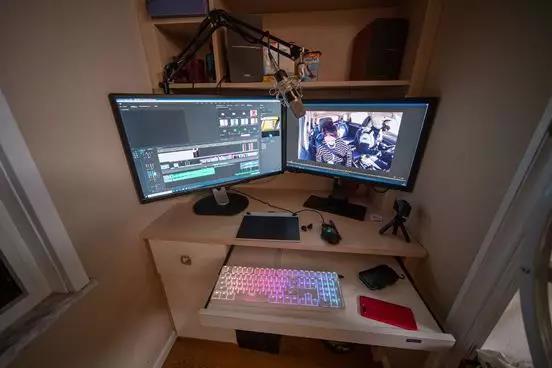 因為工作有剪輯需要,桌面上放了兩個屏幕,右邊是一臺27寸專業(yè)屏(BenQ SW2700PT),左邊則是一臺32寸普通屏。